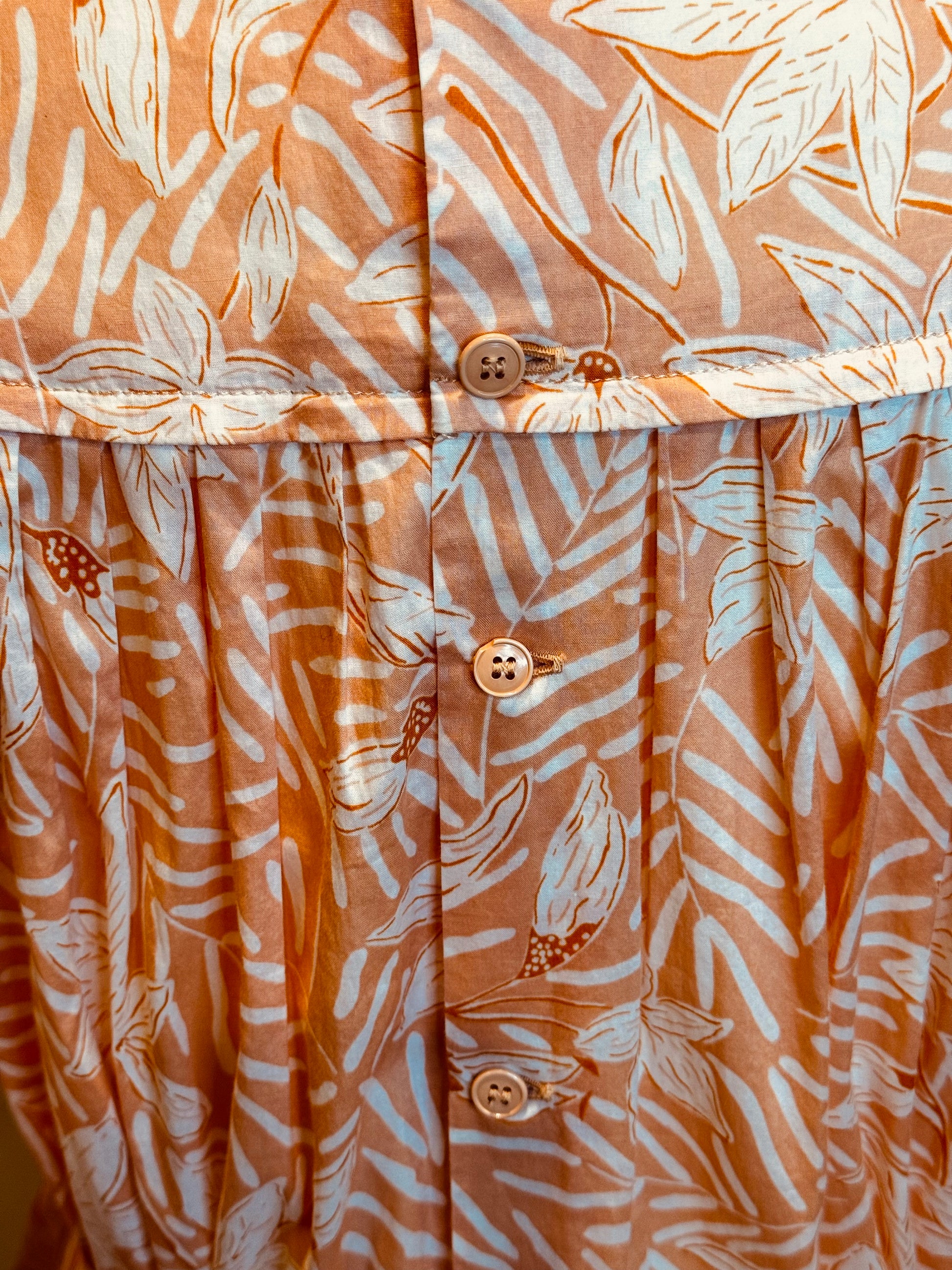 Vintage Cacharel Paris dress in size medium. featuring a warm orange-neutral botanical print with an airy, relaxed silhouette. Designed with a scoop neckline, three-quarter sleeves, and a button-down back closure.