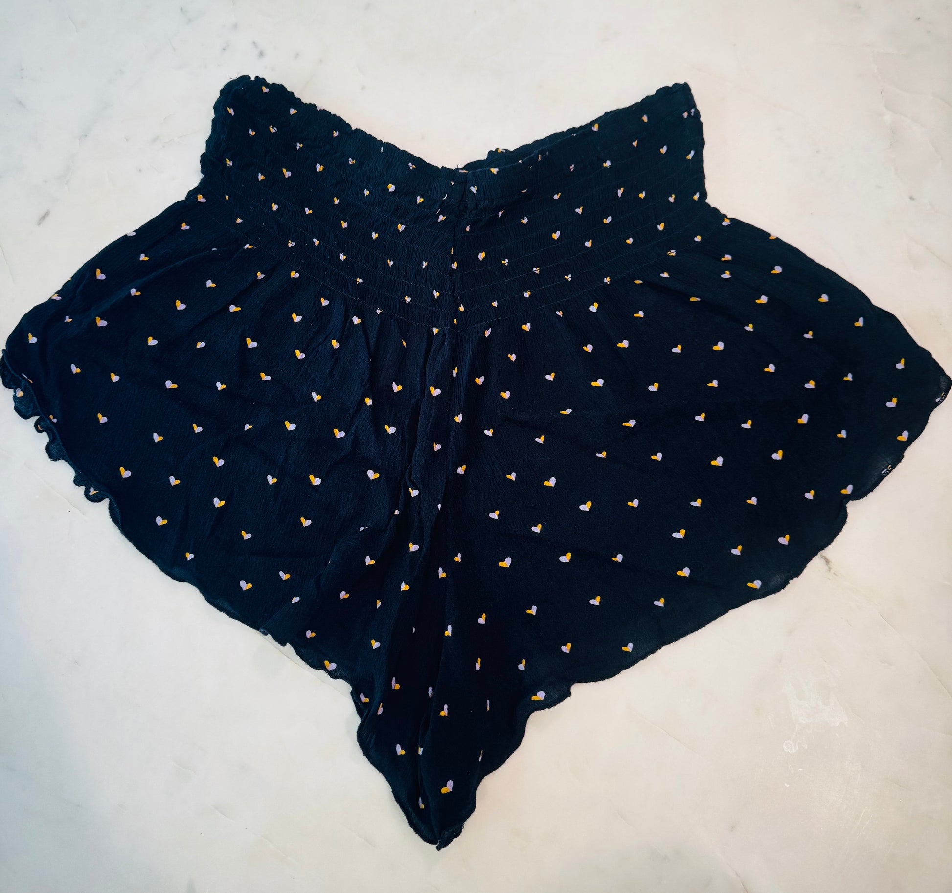 Free People heart print shorts in black with tiny gold/lavender heart prints. These lightweight, flowy shorts have a stretchy smocked waistband and a relaxing, flattering fit- perfect for lounging or festivals.