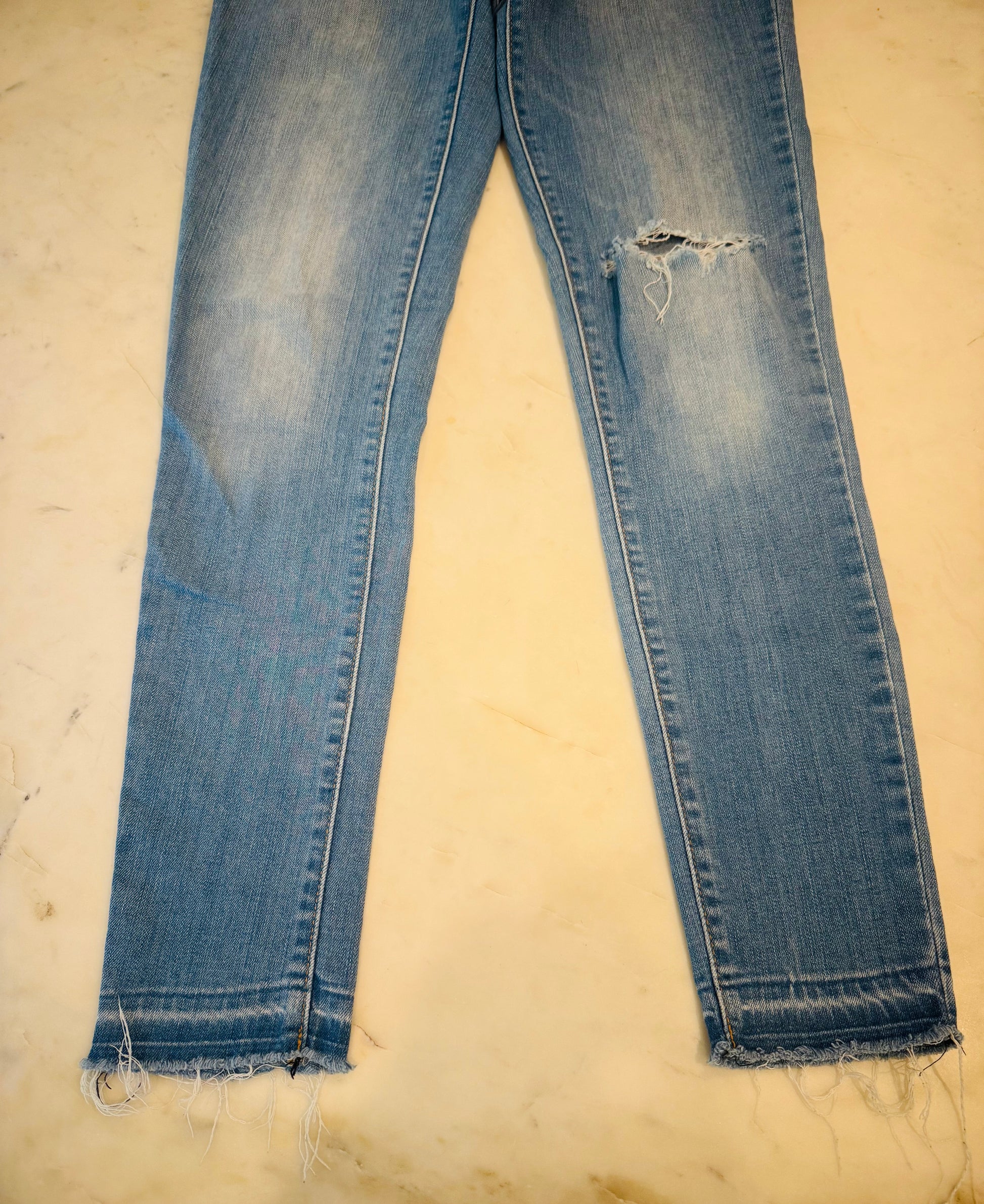 Levi’s 721 High Rise Skinny Jeans in a timeless light-wash blue. These jeans feature a flattering high-rise fit, skinny leg, and stylish distressed details on the front. The raw cut hems add the perfect lived-in, vintage-casual vibe.