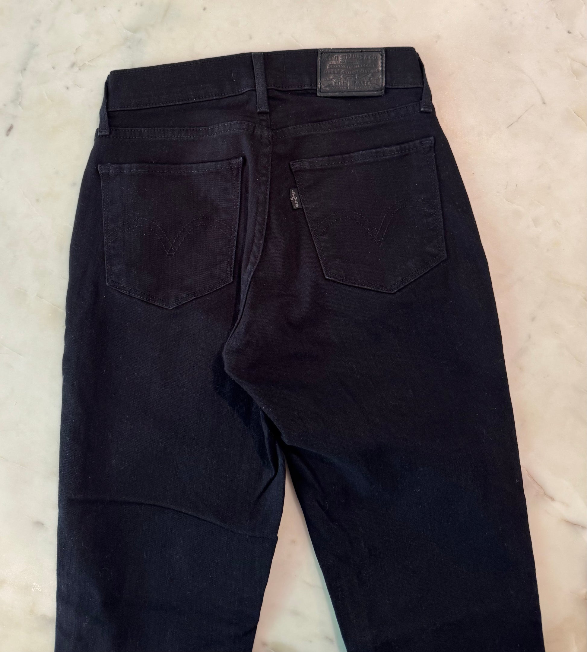 Classic Levi's Premium Curvy Skinny Jeans in black, size 24. They are designed with a curve-hugging fit and soft, stretchy denim for comfort and shape retention.