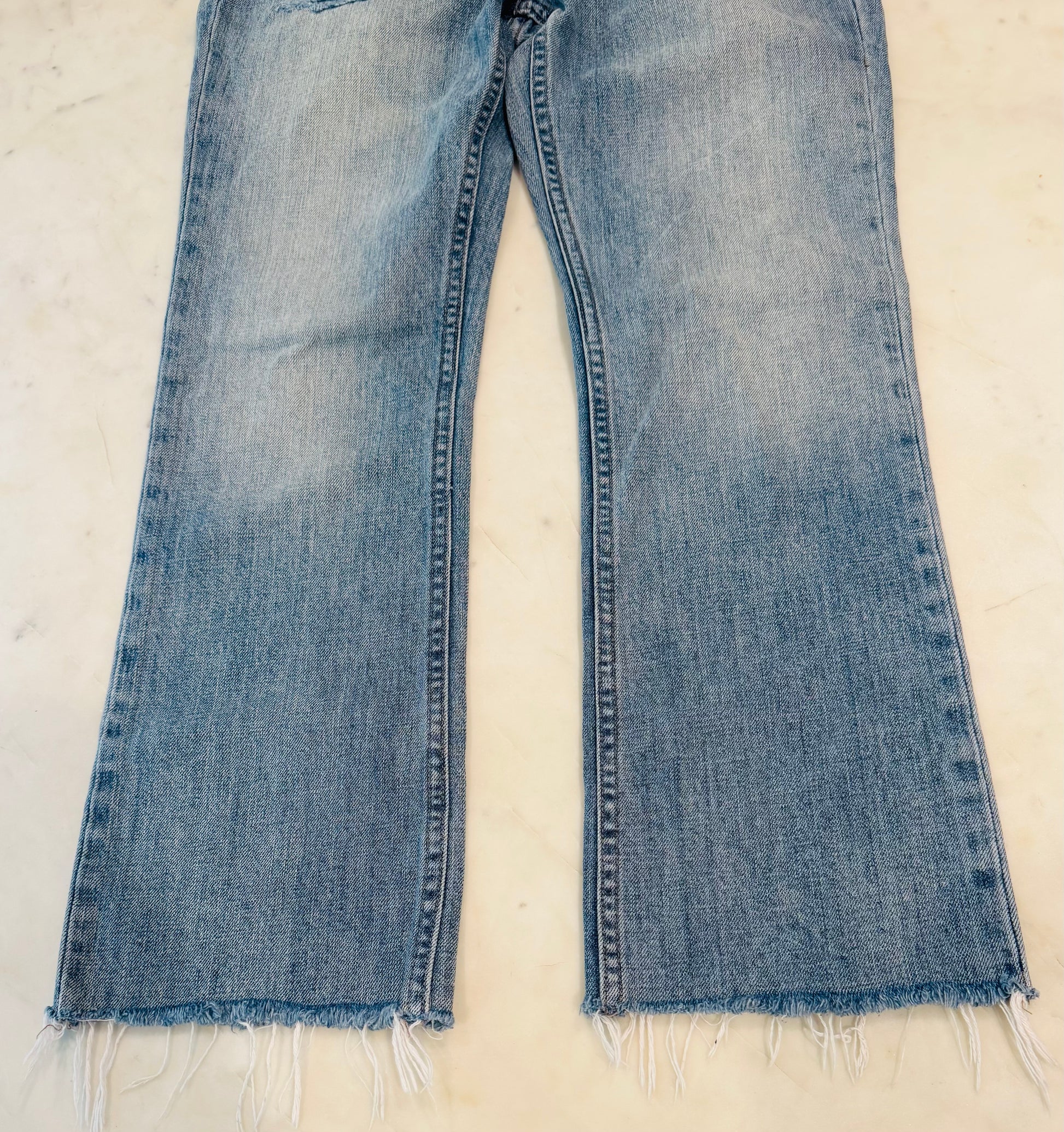 AllSaints Serene jeans feature a classic light-wash denim with a naturally worn-in look. They feature subtle distressed details on the pockets and thighs, along with a trendy raw, frayed hem.