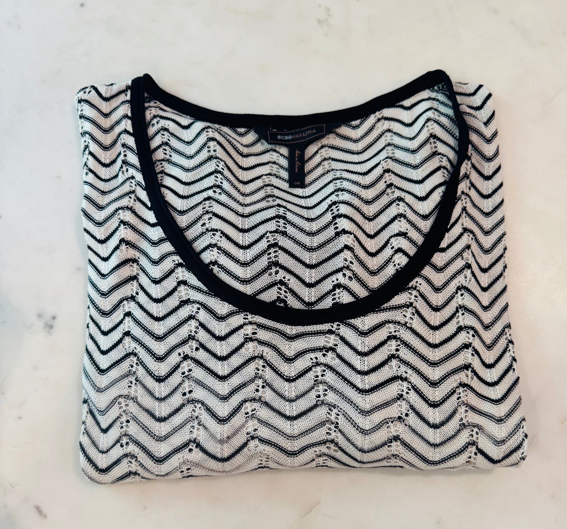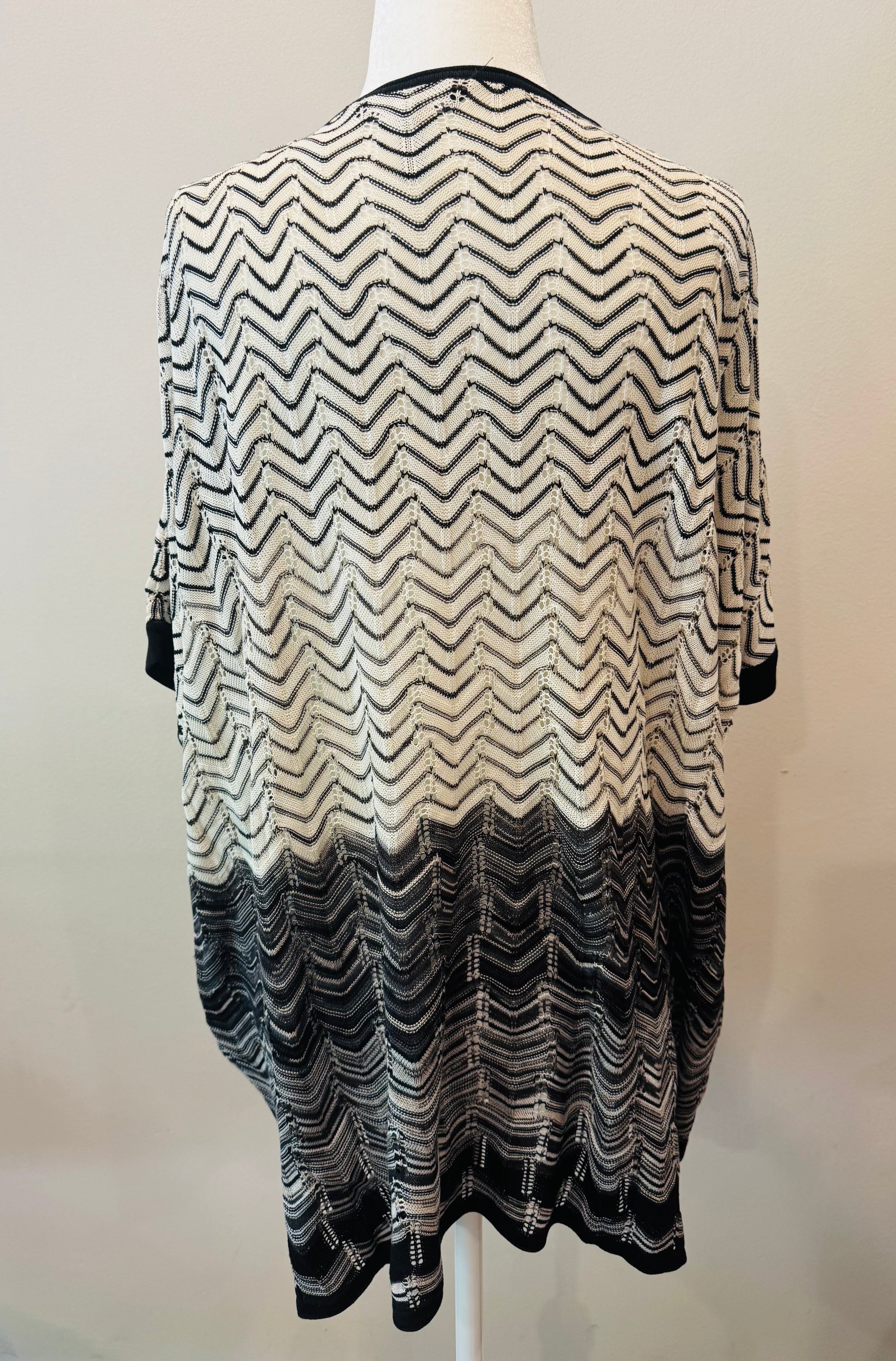 Vintage BCBG MaxAzria circa 2000s draped tunic sweater in black & white. Featuring a bold black and white chevron knit pattern with a beautiful ombre fade. The top is a silk blend that sits off the shoulder with a relaxed fit that sits at mid-thigh length.