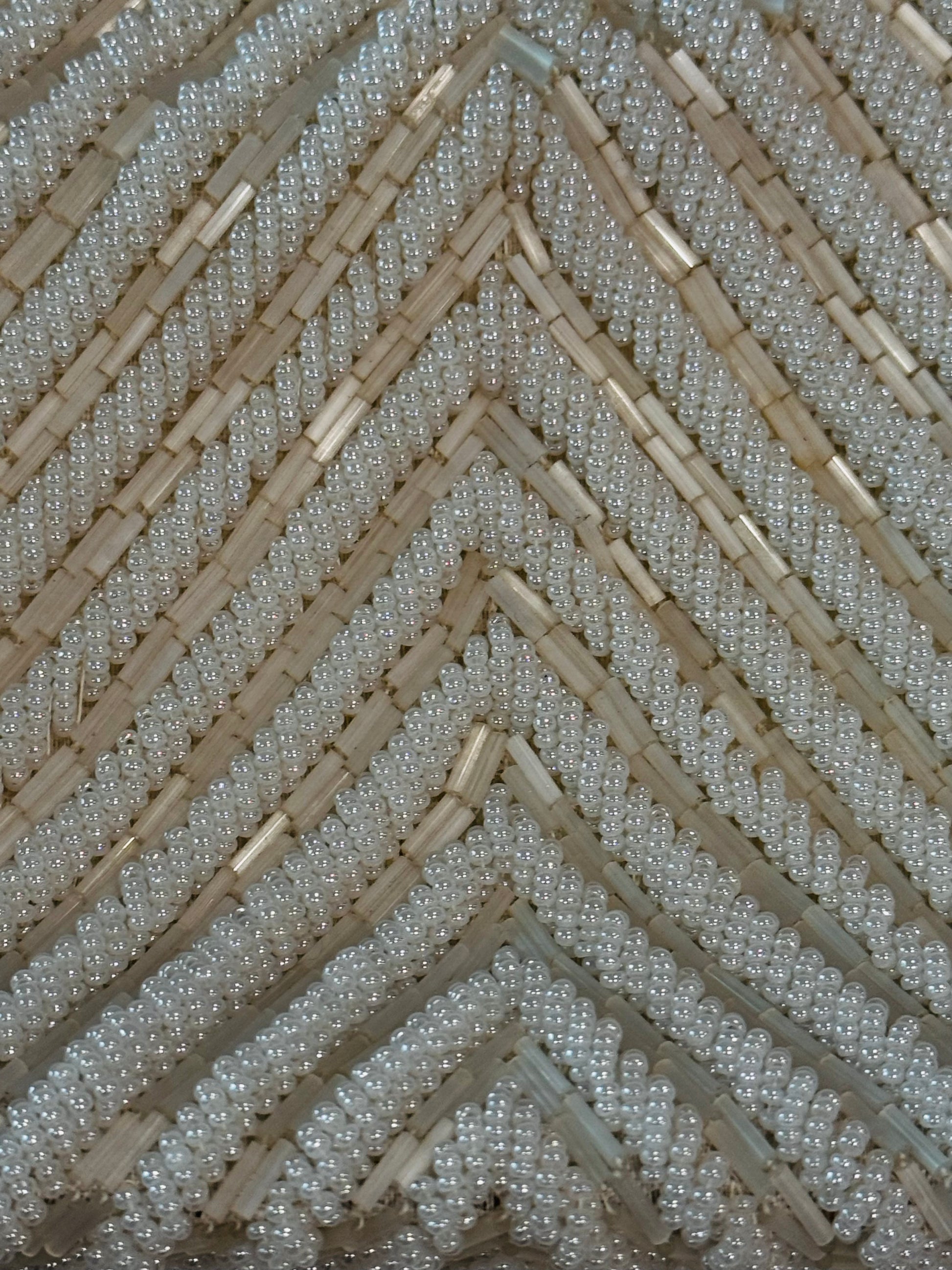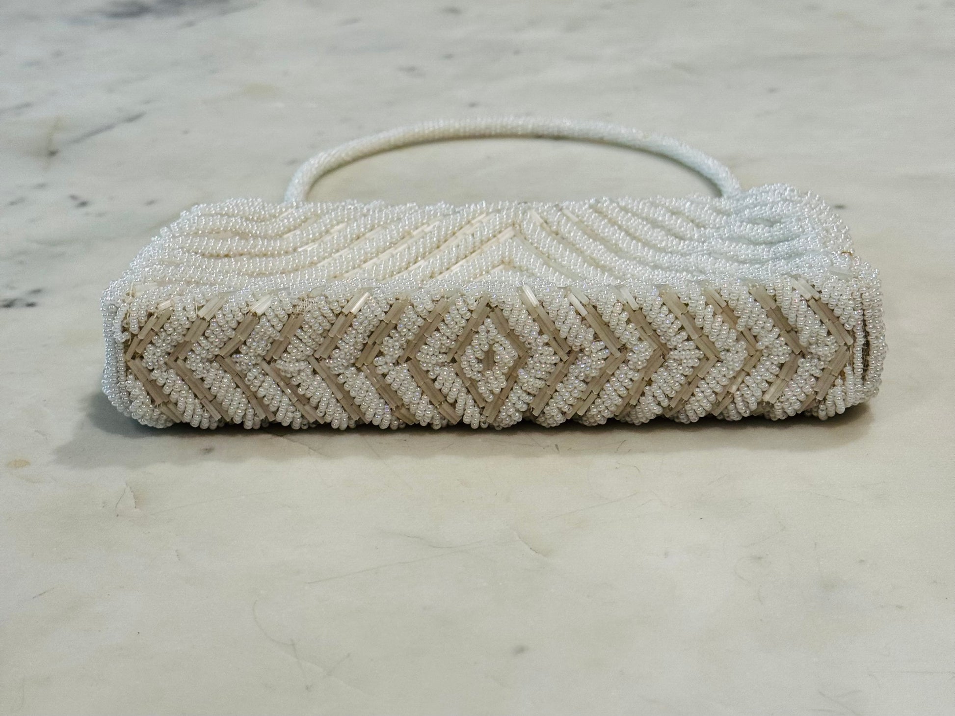 Vintage beaded evening handbag featuring intricate ivory-and-pearl-toned beadwork in a chevron pattern, finished with a gold-tone frame and rhinestone clasp.