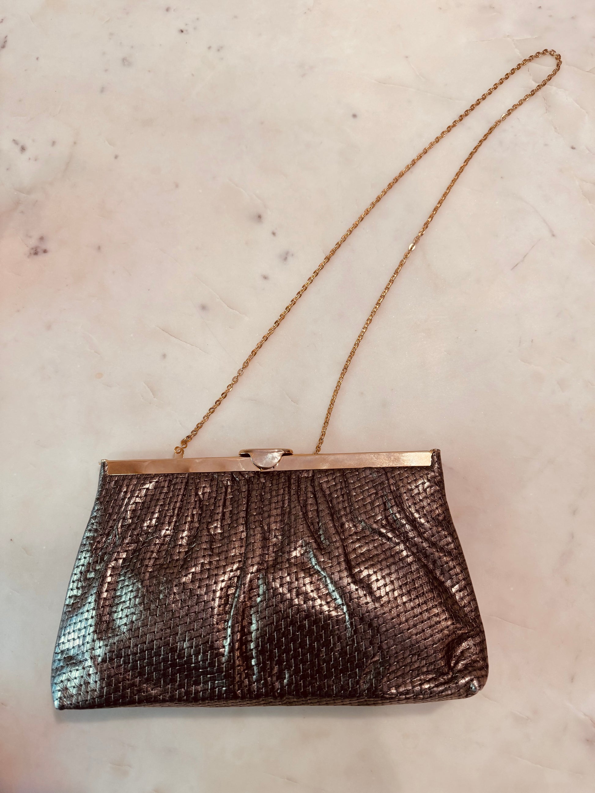 This stunning vintage Etra evening bag captures classic 1970s glamour. Made in genuine gold leather with a woven metallic texture, it features a structured gold-tone frame and a matching chain strap that can be tucked inside for clutch-style wear.