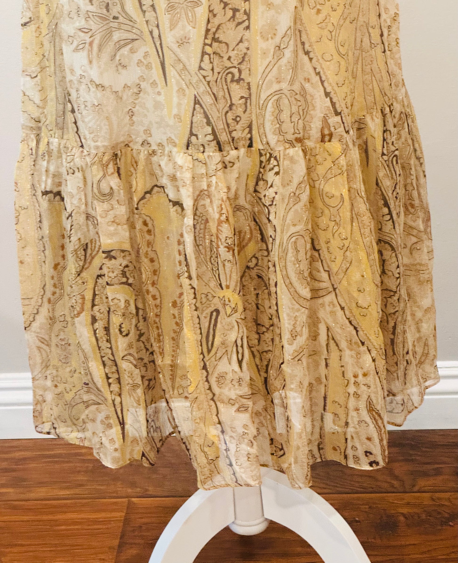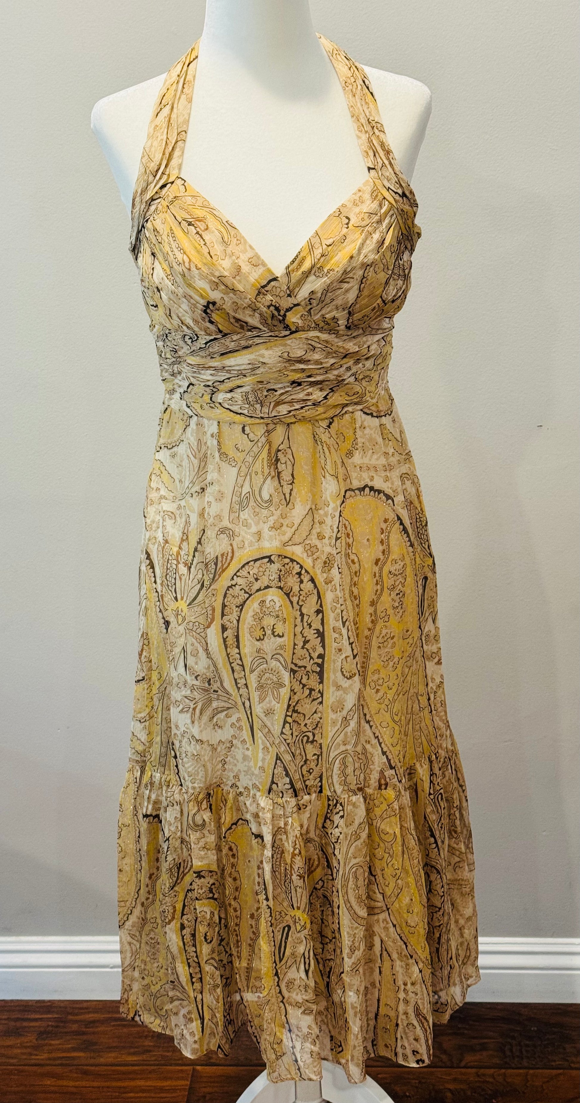 Vintage BCBG halter dress from the late 1990s / early 2000s. Featuring a boho-chic paisley print in warm beige and golden tones. The crossover halter neckline, wide ruched waist, and flowing tiered midi skirt create a flattering, feminine silhouette that works beautifully for any occasion. The dress is fully lined in a lightweight silk fabric – soft, breathable, and flowy with a tie-back halter and side zipper closure.