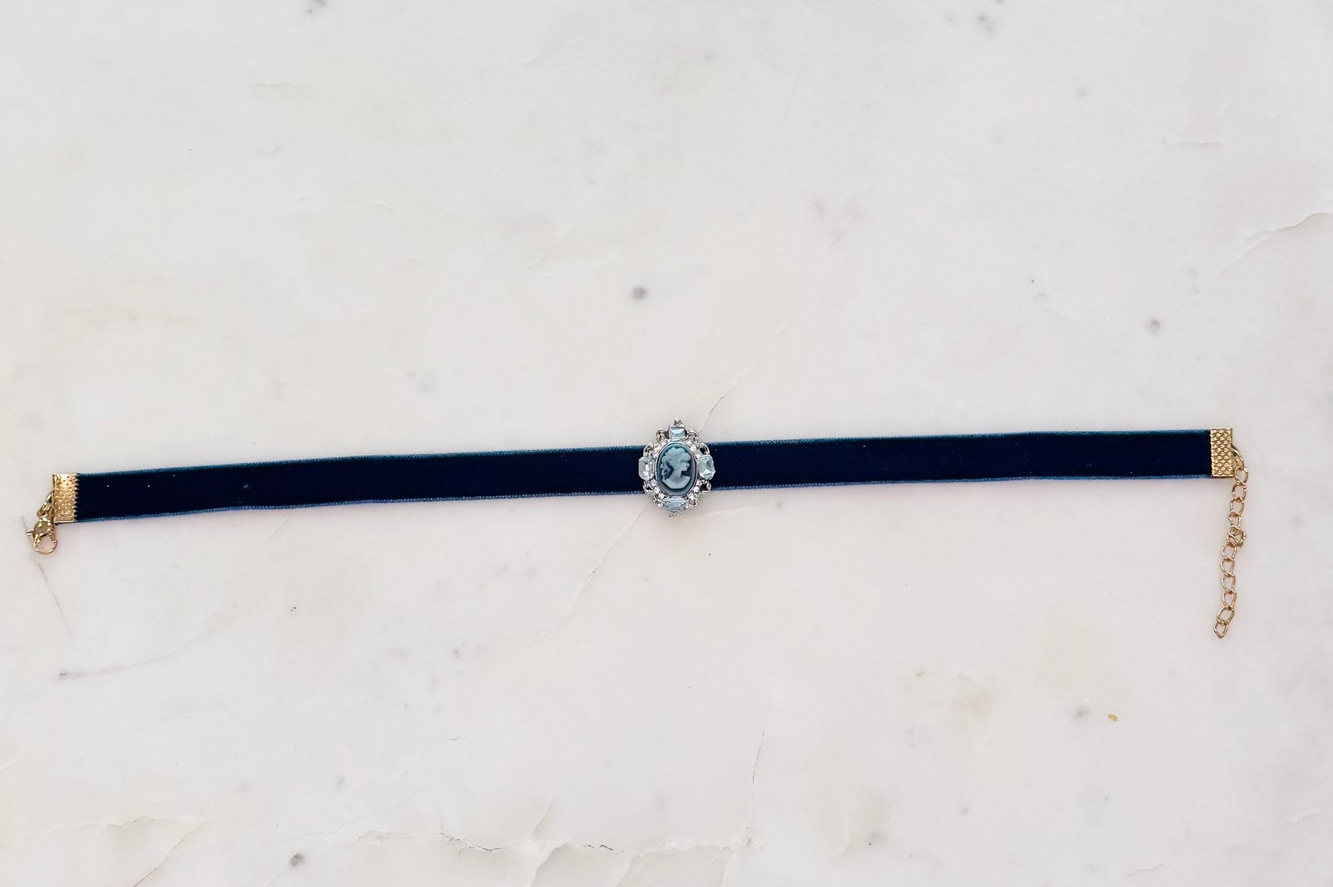Set on a rich velvet ribbon, the centerpiece features a delicately molded blue cameo framed by sparkling rhinestones, creating a refined, heirloom-inspired look. This choker sits gracefully at the neckline and adds a touch of quiet luxury to any ensemble.